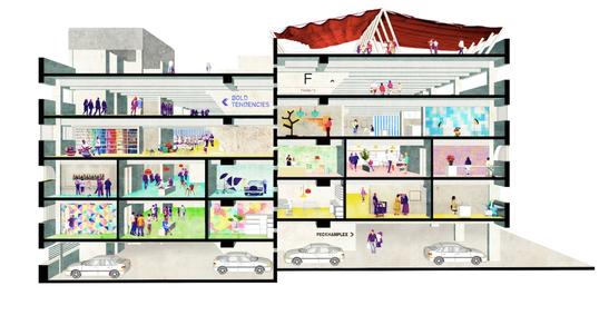 The bottom four levels will house artist’s studies, maker workshops and shared workspace for young creative businesses (47%), says Pop Community. Meanwhile, levels five and six will provide gallery, performance and multi-purpose events spaces (46%), some retail space (4%) where the artistic community can promote its work, alongside food and beverage units for independent traders from the local area (3%). There will still be parking on the ground level.