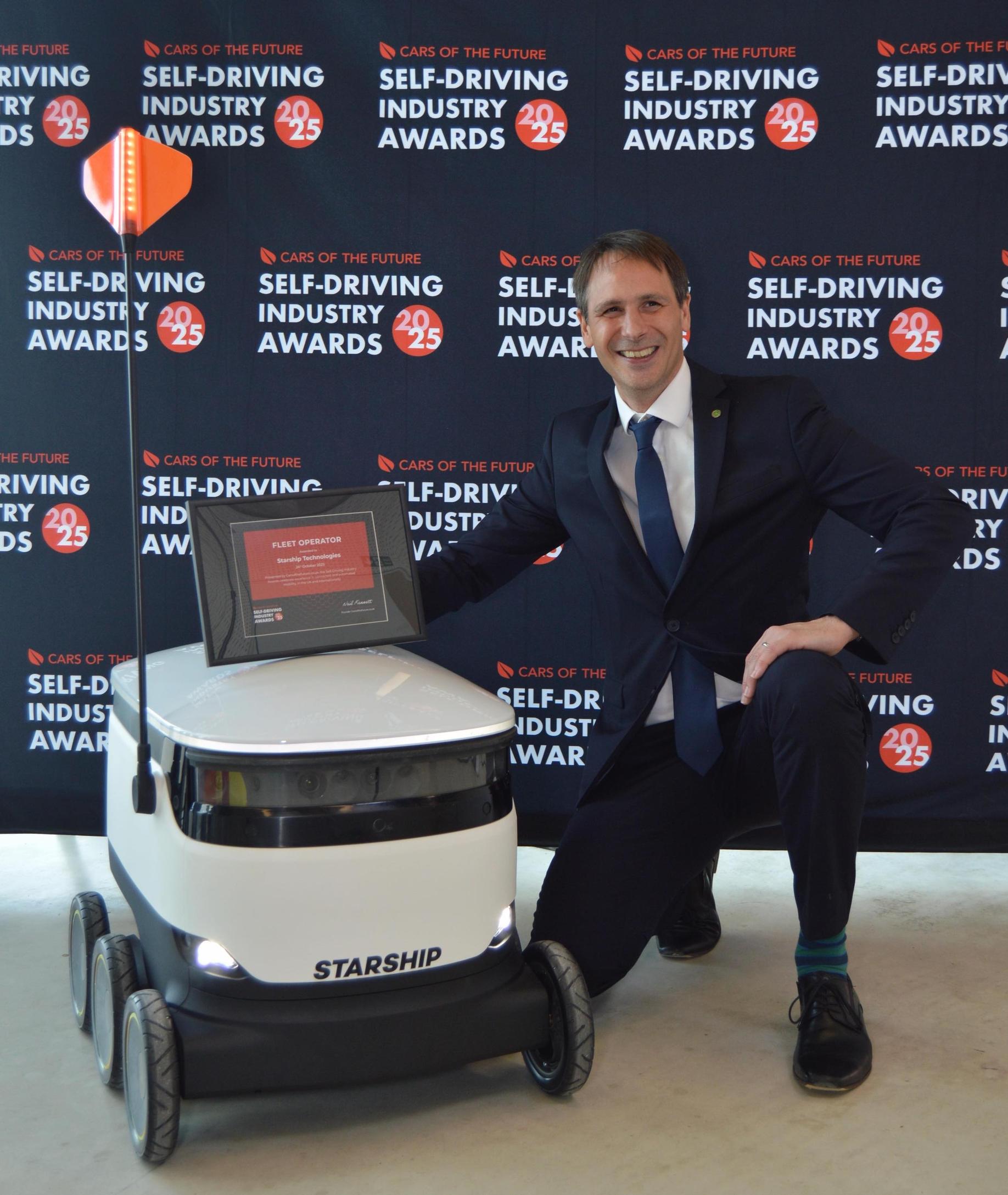 Cars Of The Future editor Neil Kennett with a Starship delivery robot at SDIA25