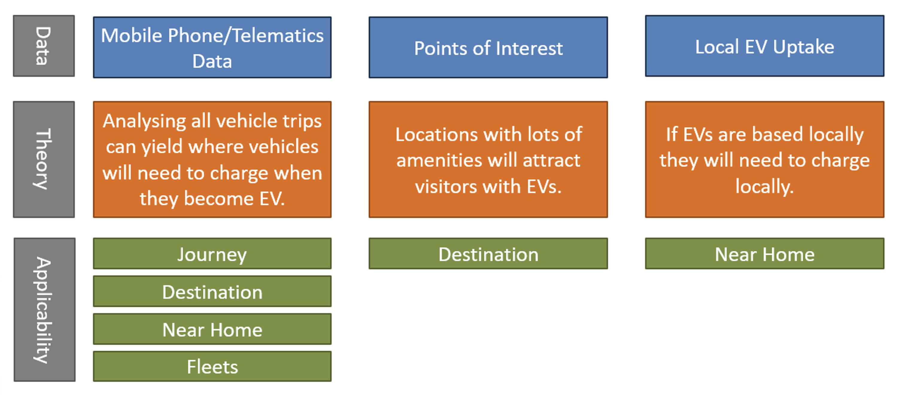 - Mobile phone/telematics data: This approach uses anonymised data from mobile phones and vehicle telematics to analyse real-world driving patterns. By understanding where vehicles currently travel, their journeys, destinations, and places they park overnight, we can extrapolate where those same vehicles will need to charge when they become electric. This method is highly effective for planning chargers for journeys, destinations, and residential (near-home) use cases.