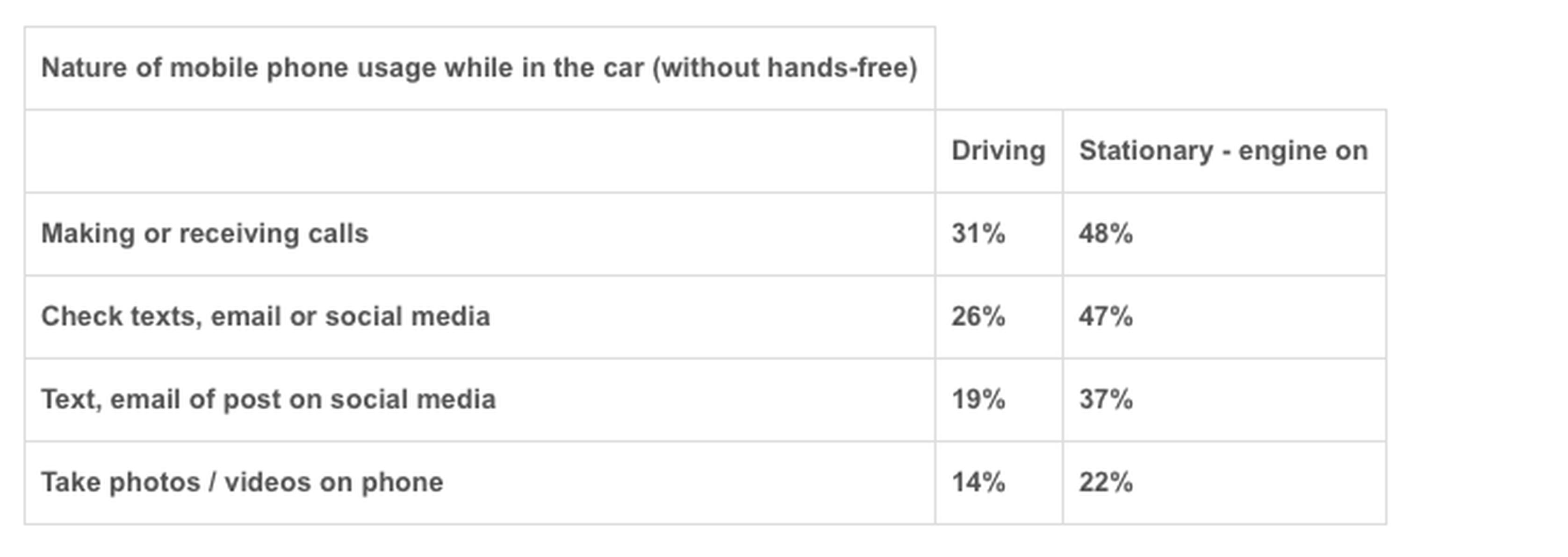 Figures for other types of handheld phone use while in control of a moving vehicle are particularly alarming: 26% admit they have checked messages while driving in the last 12 months, while 19% have written and sent texts, emails or social media updates, despite the huge distractions involved. These figures rose dramatically when the driver was in stationary traffic with 46% admitting they check messages and 38% admitting they had written texts, emails or posted social media updates.