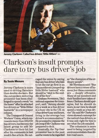 Motoring journalist Jeremy Clarkson took aim at the nation's bus drivers in his column in The Sun on 10 June. "Generally speaking, it is impossible to generalise about how certain behave behind the wheel and, specifically, what sort of person is a 'bad driver'," he claimed. "But there is an exception to this rule. There is one group of motorists who are all as bad as each other. Bus drivers."