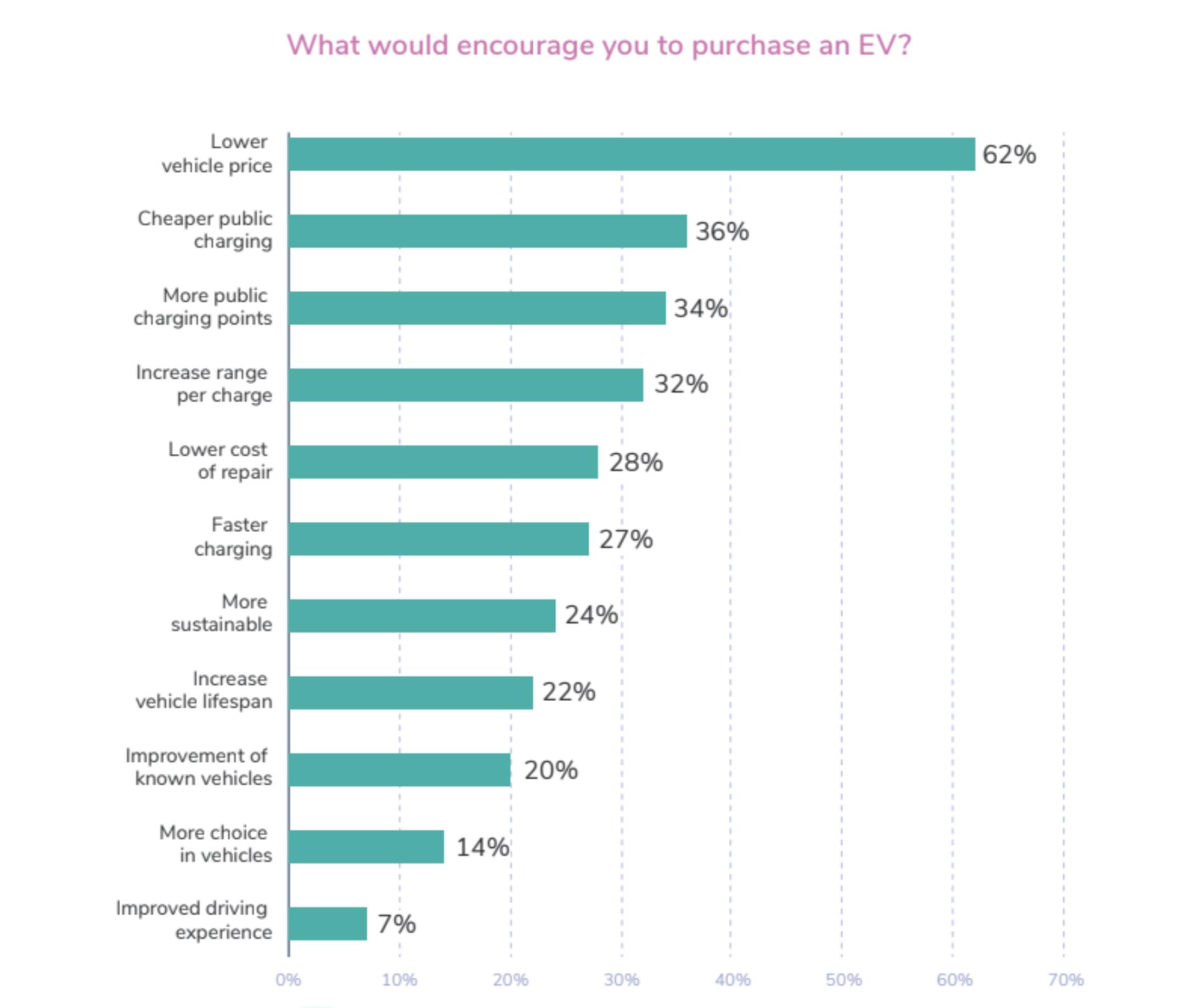Despite the growth, cost remains the primary barrier to EV adoption. When asked what would encourage them to purchase an EV, 62% of Commuter Census respondents said: “Lower vehicle price”. This was followed by: “Cheaper public charging” (36%), “More public charging points” (34%), and “Increased range per charge” (32%).