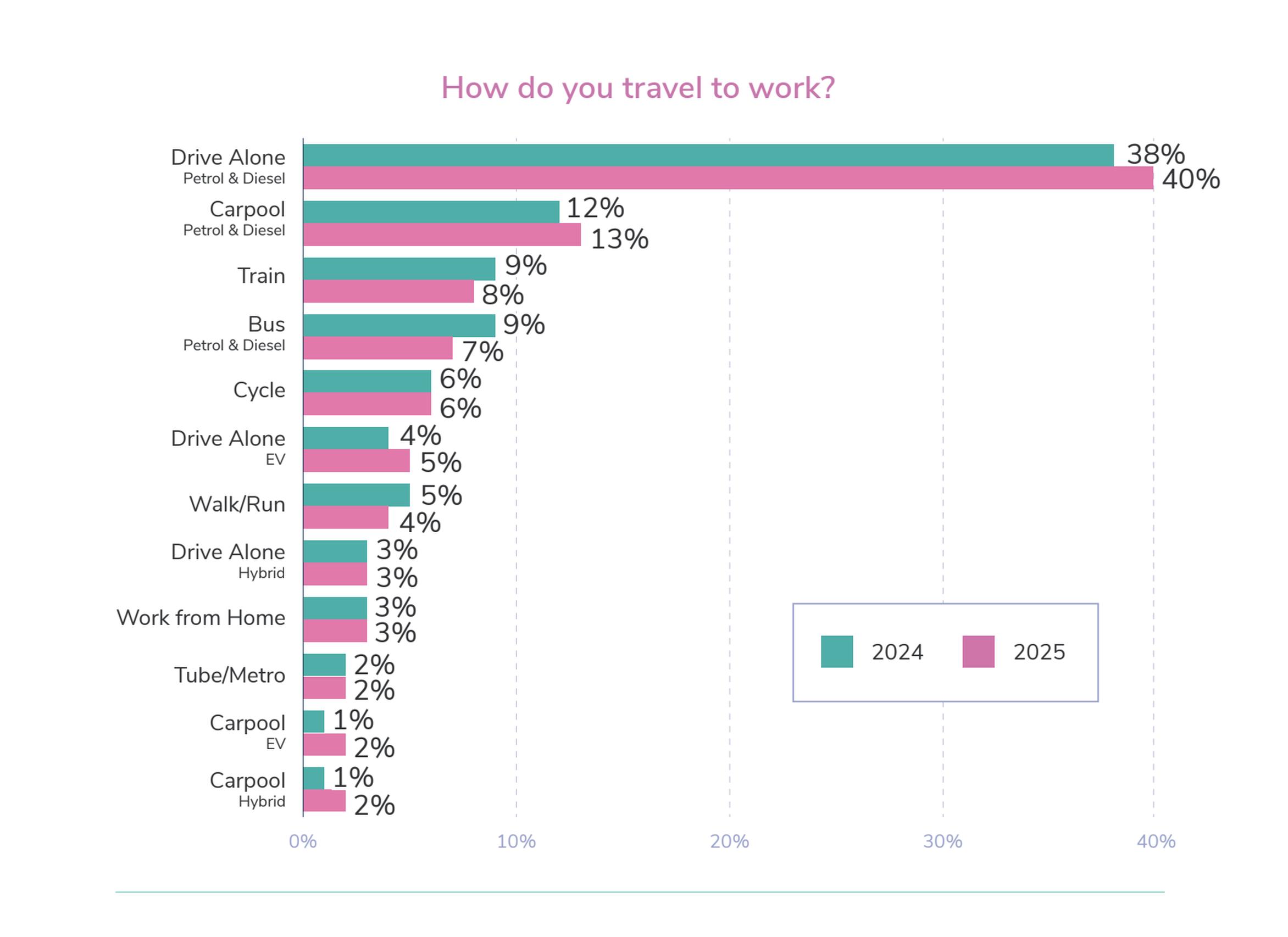 The number of respondents commuting alone in a petrol or diesel car has increased from 38% in 2024 to 40% in 2025, marking the first increase in solo driving since 2022.
