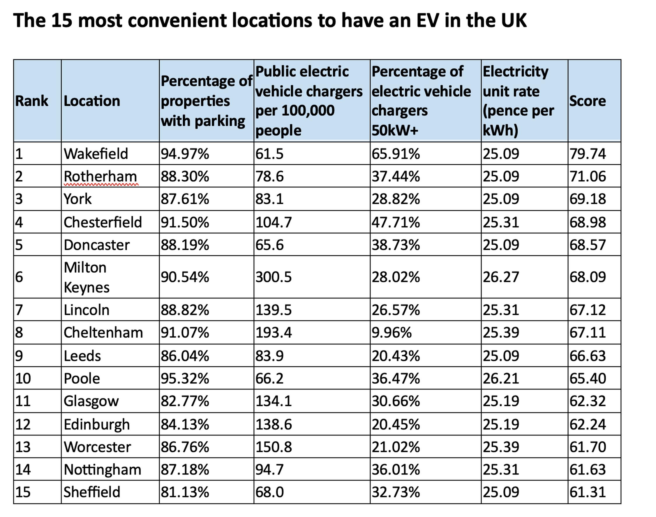 Rotherham and York round out the top three, highlighting South and North Yorkshire as some of the most EV-friendly areas in the UK.