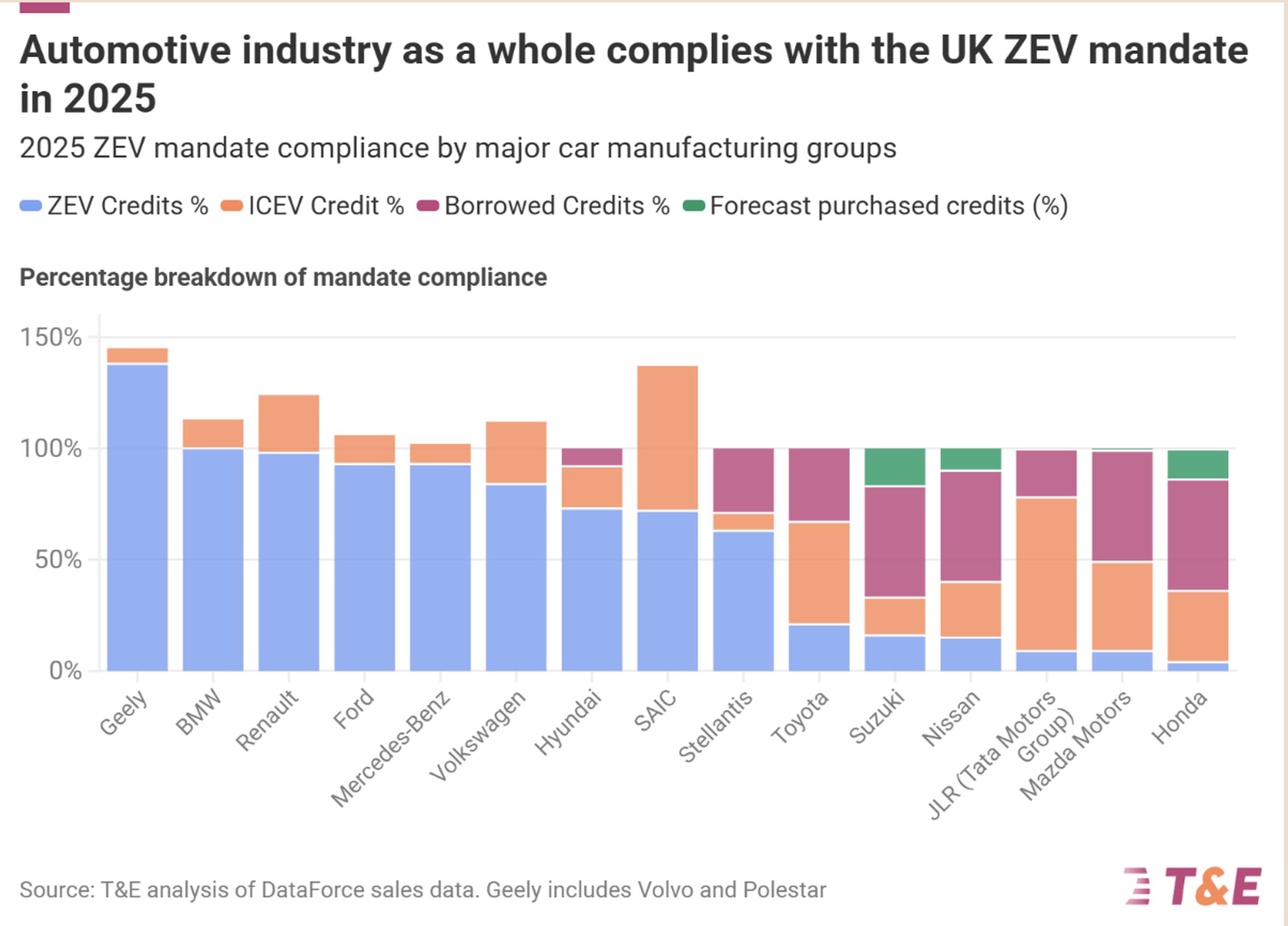 Ford exceeded the 28% headline target without the use of flexibilities. Succeeding due to early investment, competitive pricing and new model launches. The electric Ford Puma, now eligible for the full £3,750 Electric Car Grant, recorded close to 10,000 registrations in 2025, making it one of the best-selling affordable BEVs of the year. And this year Nissan has a range of new models, including the Sunderland-built LEAF, showcasing a clear opportunity to rebuild their BEV sales at scale, and move back onto a sustainable compliance pathway.