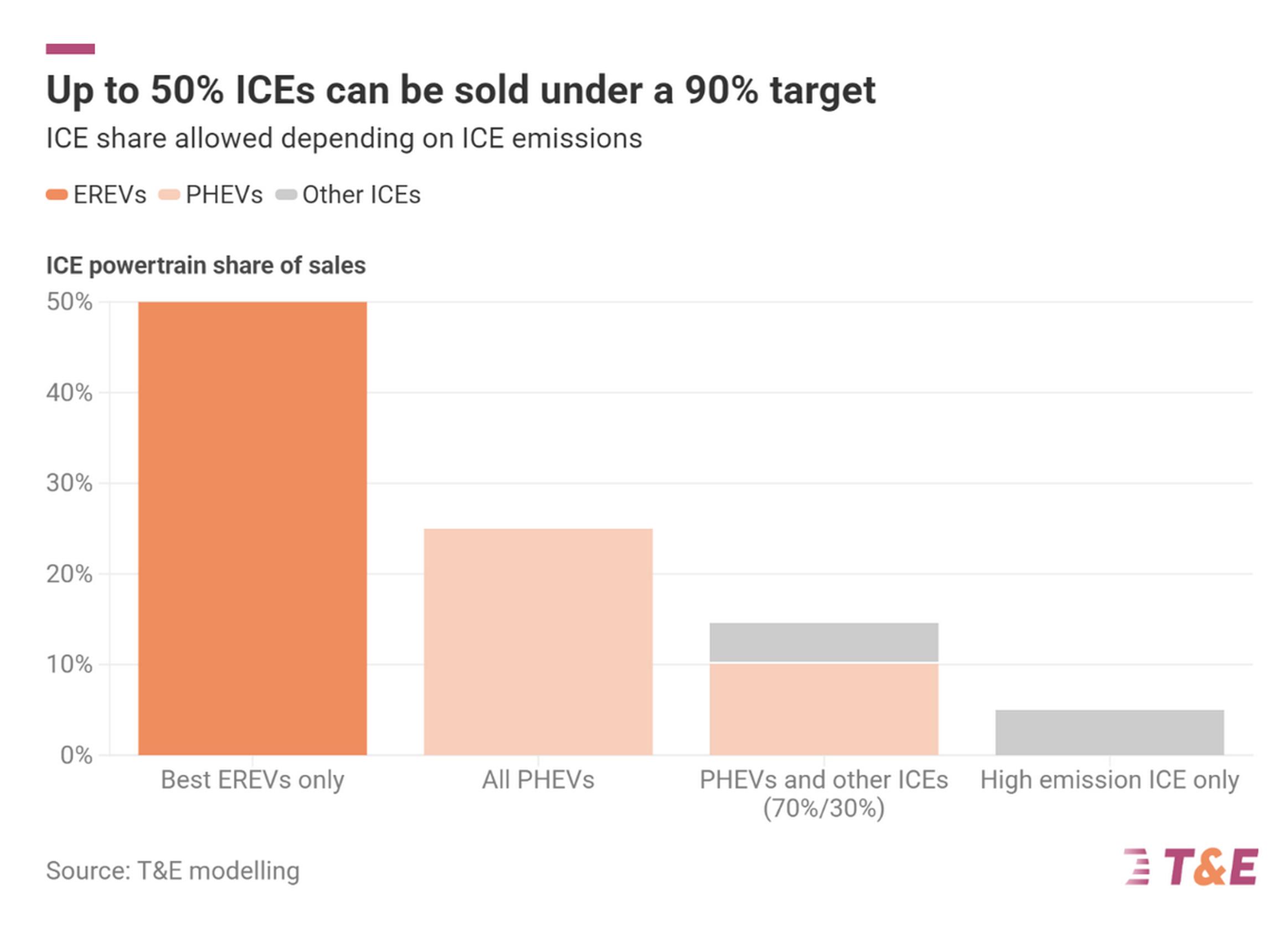 The precise BEVs share in 2035 will vary depending on the combustion car mix of each carmaker. The 90% CO2 reduction target means that, on average, carmakers’ fleet emissions would have to stay below 11 grams of CO3 per km in 2035. After 2035, this would allow carmakers to sell any type of powertrain. With best-in-class range extenders (EREVs) at 22 g/km, their share could reach up to 50%. T&E said the EU Commission proposal would undermine the certainty Europe needs to invest heavily in electrification and compete with China.