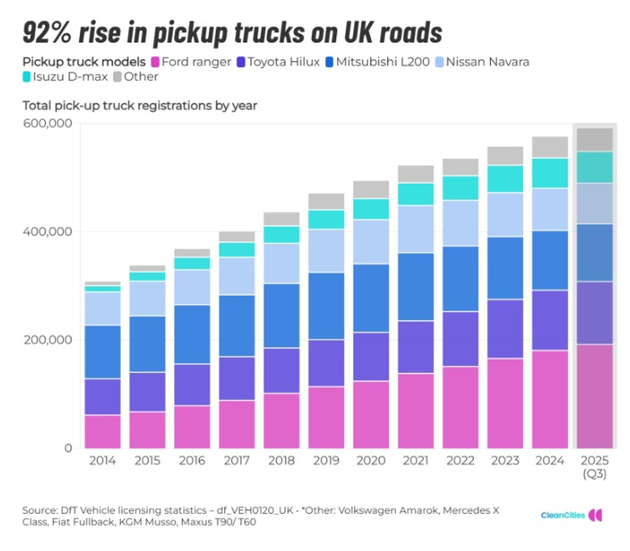The 10 most common pick-up models — including the Ford Ranger, Toyota Hilux, Mitsubishi L200 and Nissan Navara — account for more than half-a-million registered vehicles as of Q3 2025, according to Clean Cities’ assessment.