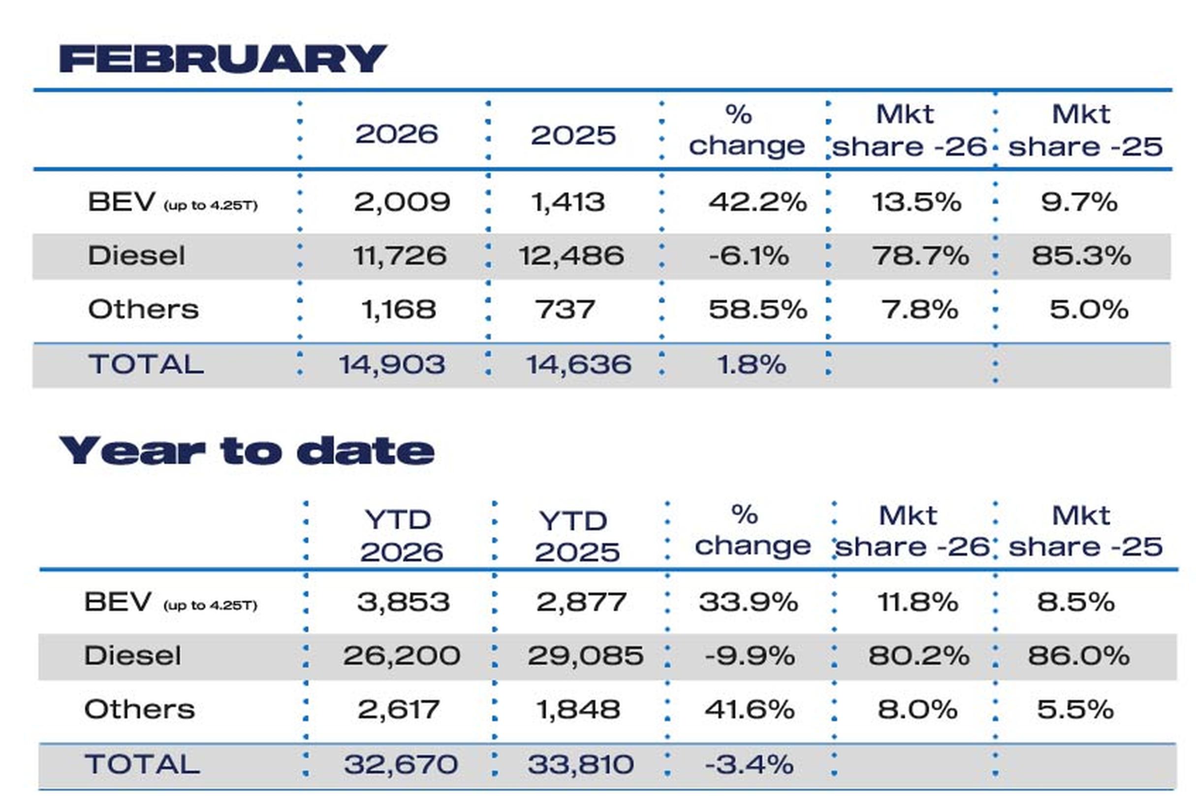 UK new light commercial vehicle (LCV) registrations rose by a modest 1.1% in February, with 14,641 vans, pickups and 4x4s joining the road, according to the latest figures published by the Society of Motor Manufacturers and Traders (SMMT).