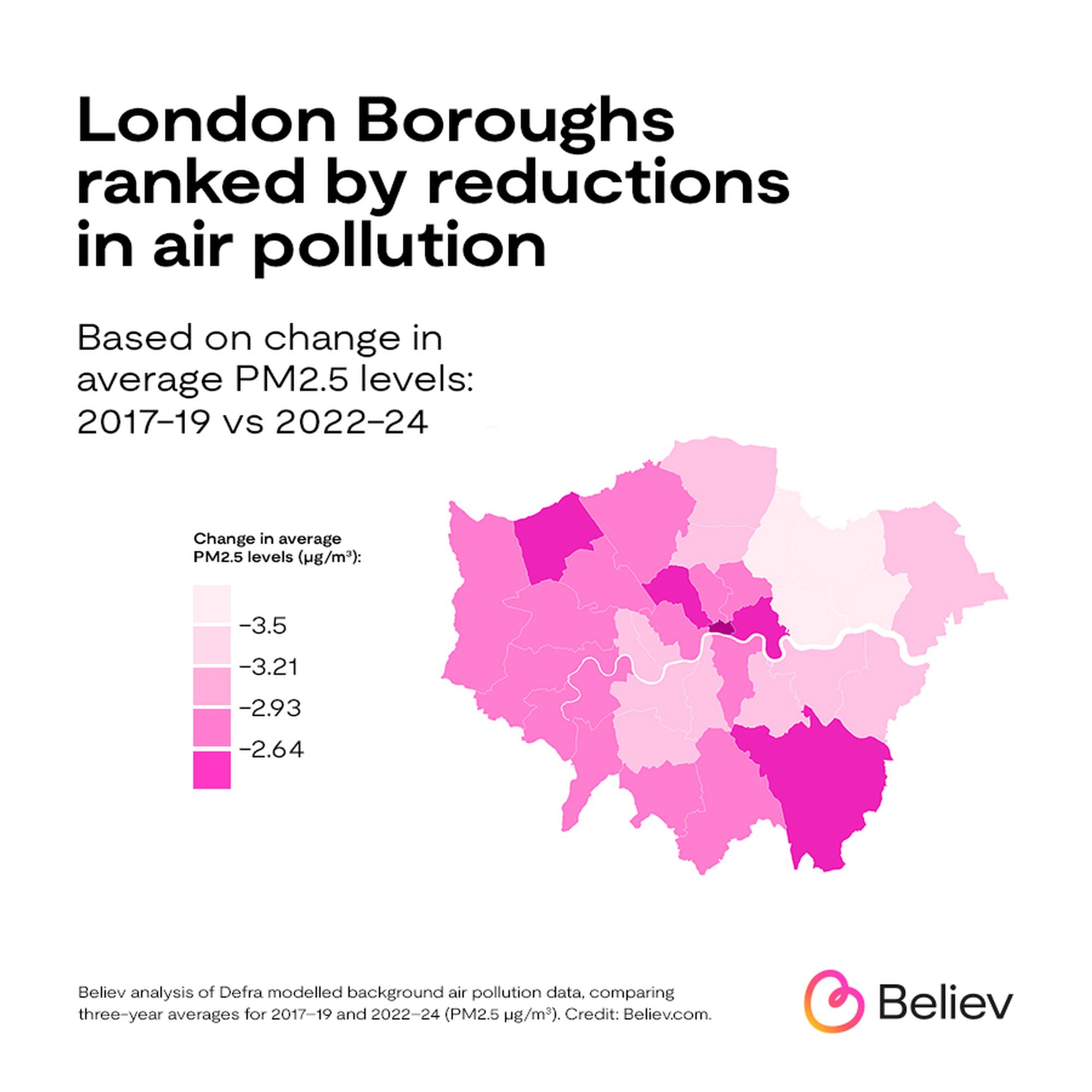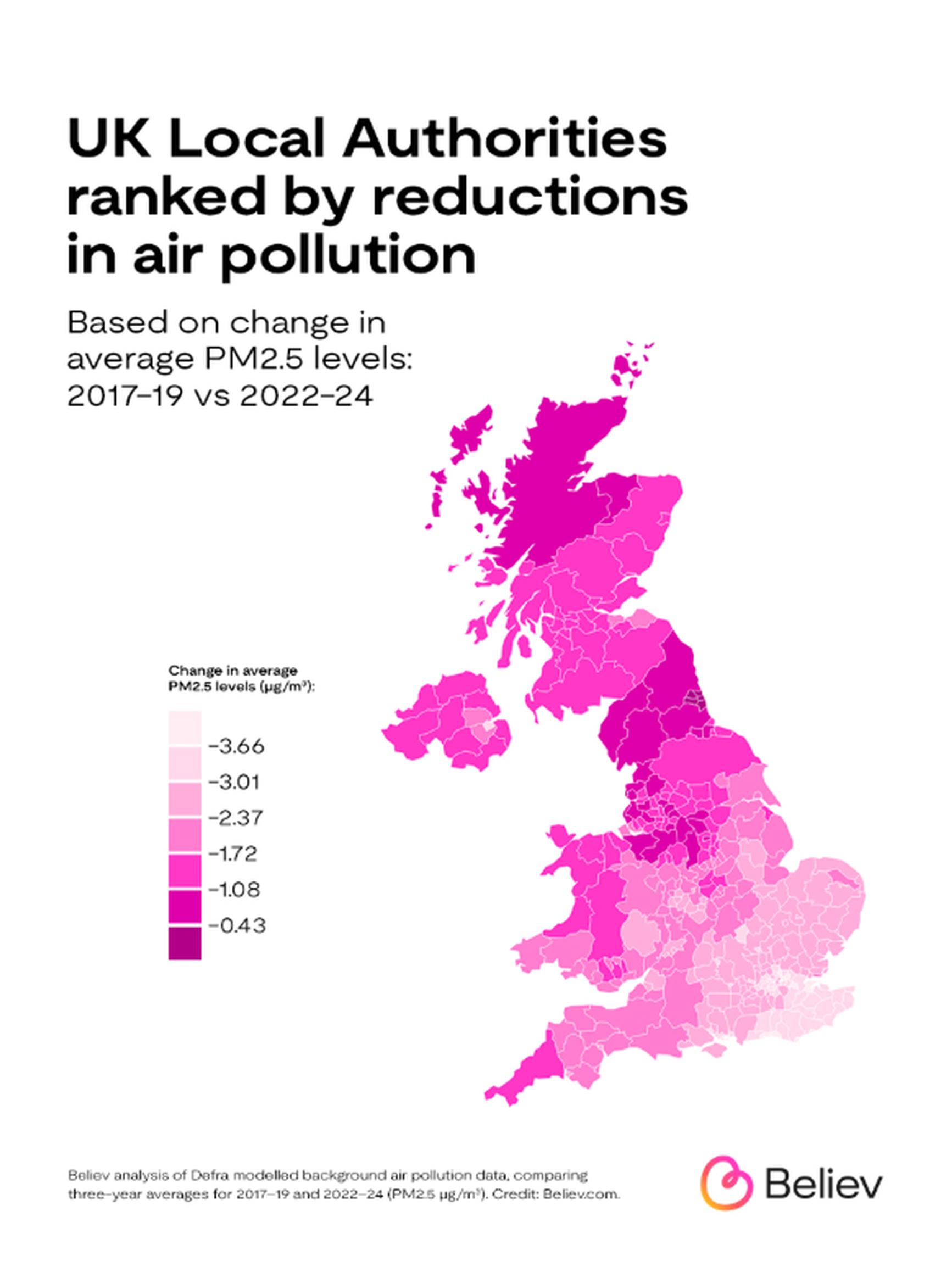 Believ analysed the change in air pollution levels in 2017–2019 vs 2022–2024, excluding COVID years, using annual mean data from Defra (Department for Environment, Food & Rural Affairs).