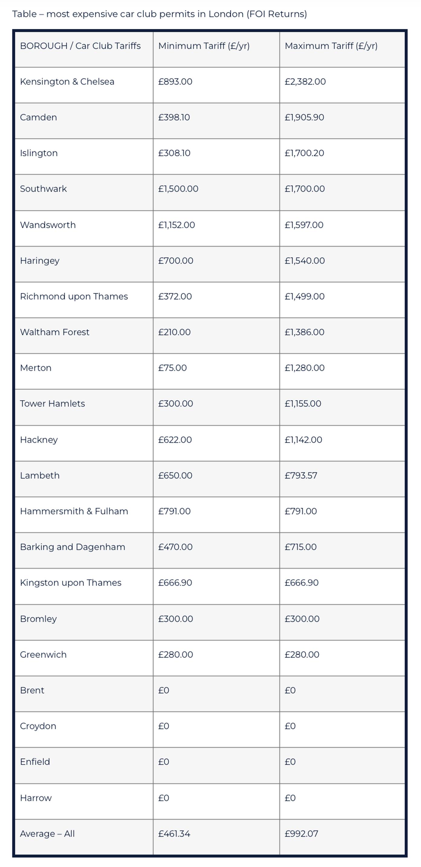 A small number of boroughs do not charge for bay permits for car clubs, including Brent, Croydon, Harrow and Enfield.