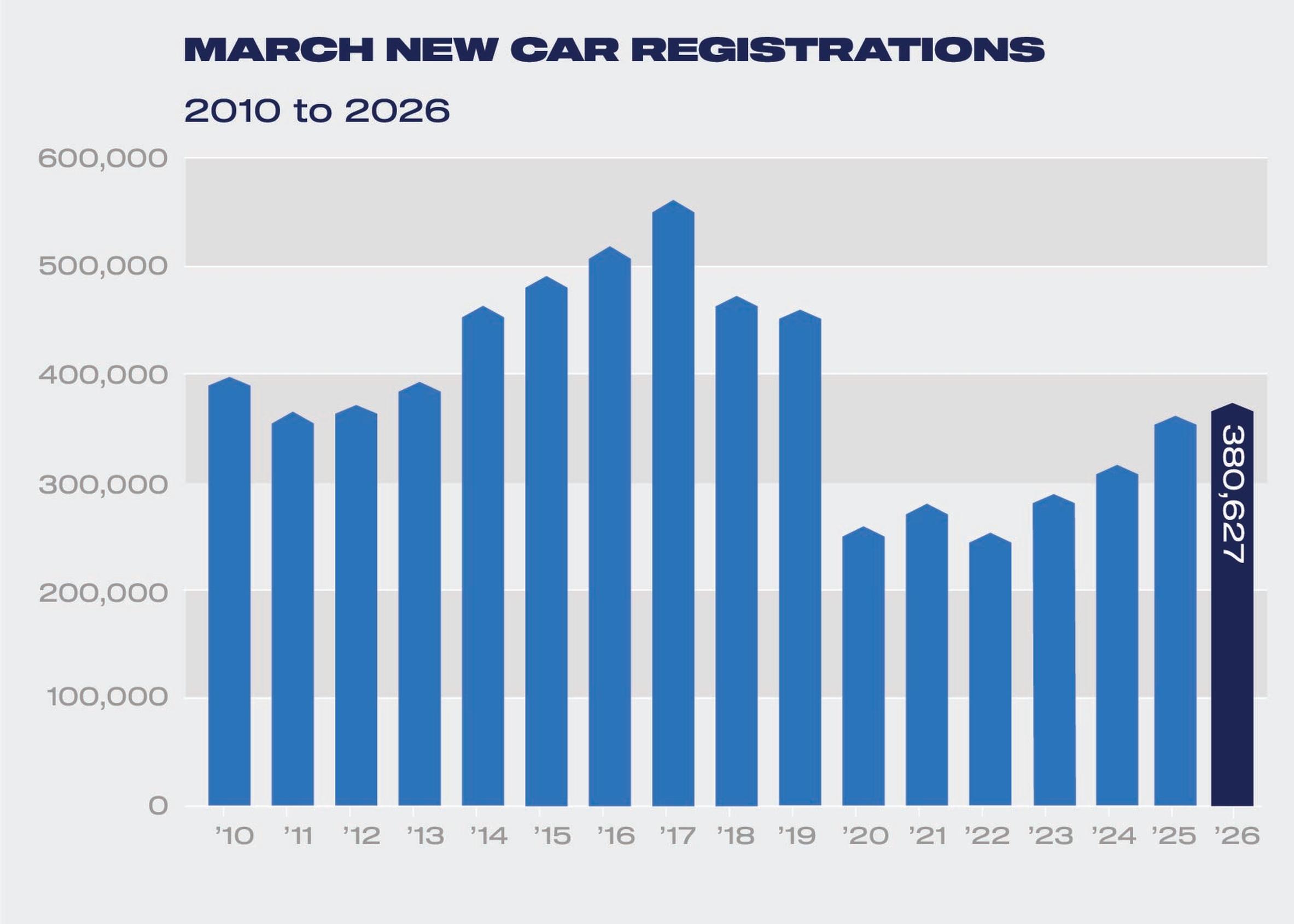 The UK new car market grew by 6.6% in March, typically the busiest month of the year, with 380,627 new vehicles registered, according to the latest figures published by the Society of Motor Manufacturers and Traders (SMMT). The performance marks the best March – and best month overall – since 2019.