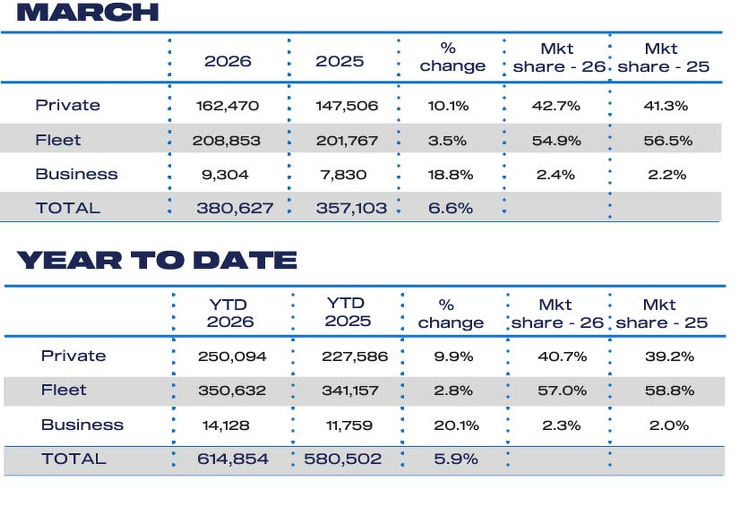 Growth was driven primarily by private demand, with retail registrations rising 10.1% to 162,470 units. Fleet registrations increased 3.5% to 208,853 units, while the smaller business sector grew 18.8% to 9,304 units.