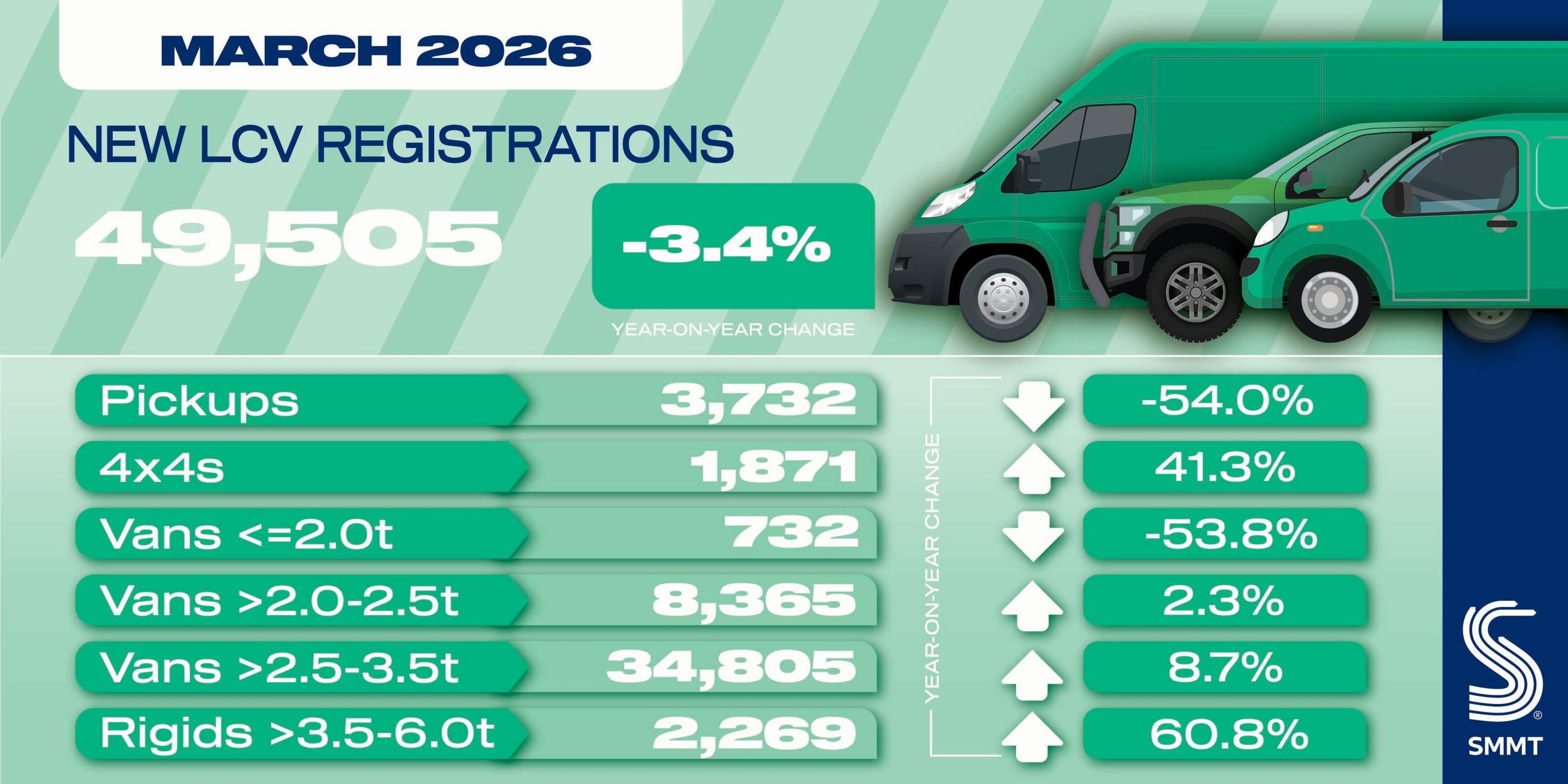 The UK’s new light commercial vehicle (LCV) market declined by -3.4% in March, with 49,505 vans, pickups and 4x4s joining the road, according to the latest figures published by the Society of Motor Manufacturers and Traders (SMMT).