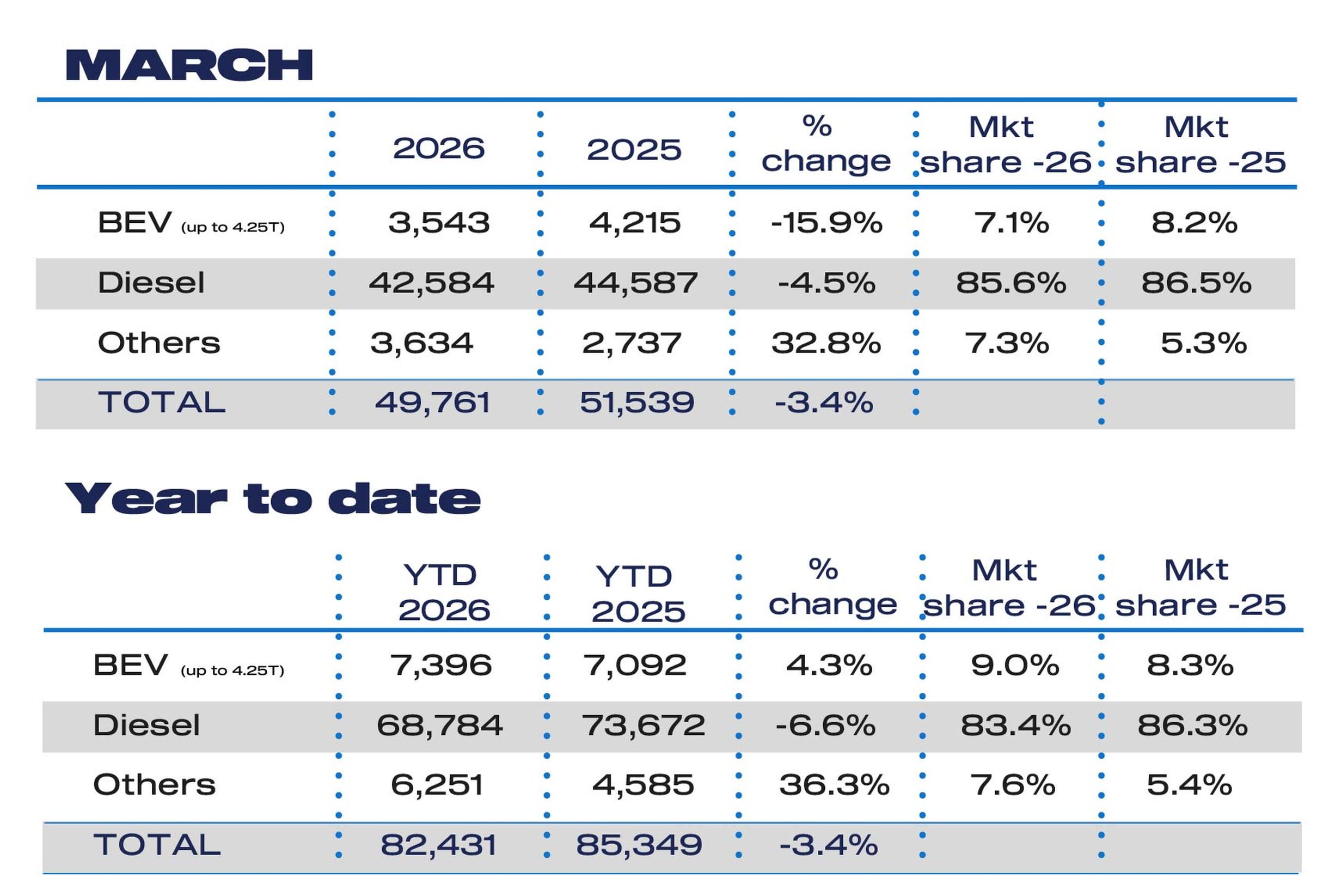 The SMMT regards March’s -15.9% decline in battery electric van (BEV) uptake is a significant concern, with just 3,543 units registered and a market share of 7.1% – the weakest since September 2024.