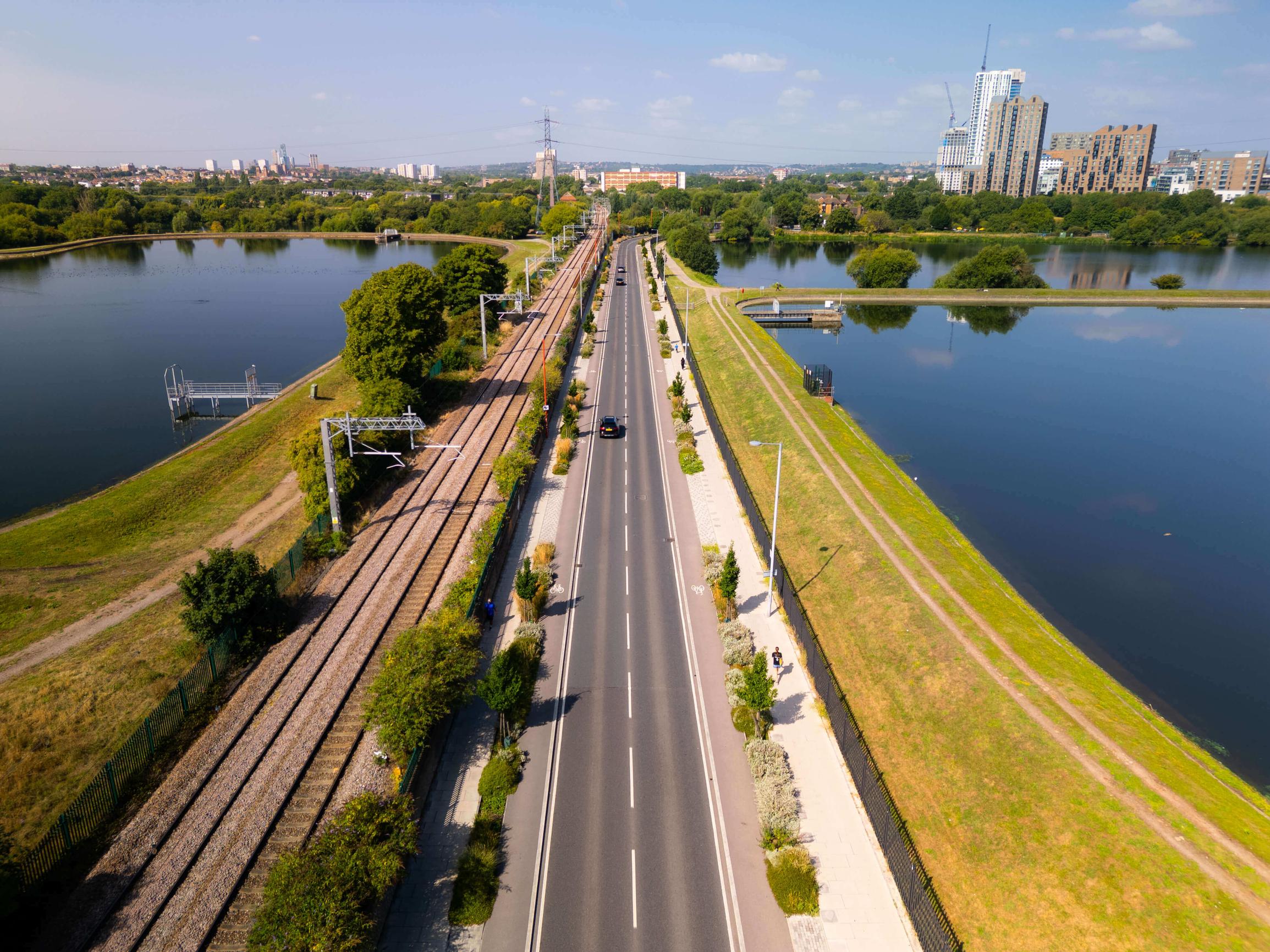 The road is flanked by Walthamstow Wetlands, Europe’s largest urban wetland nature reserve, spanning over 500 acres with ten reservoirs.