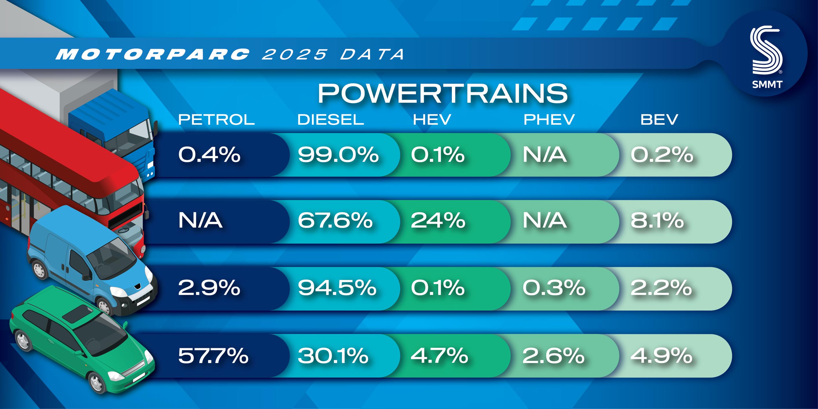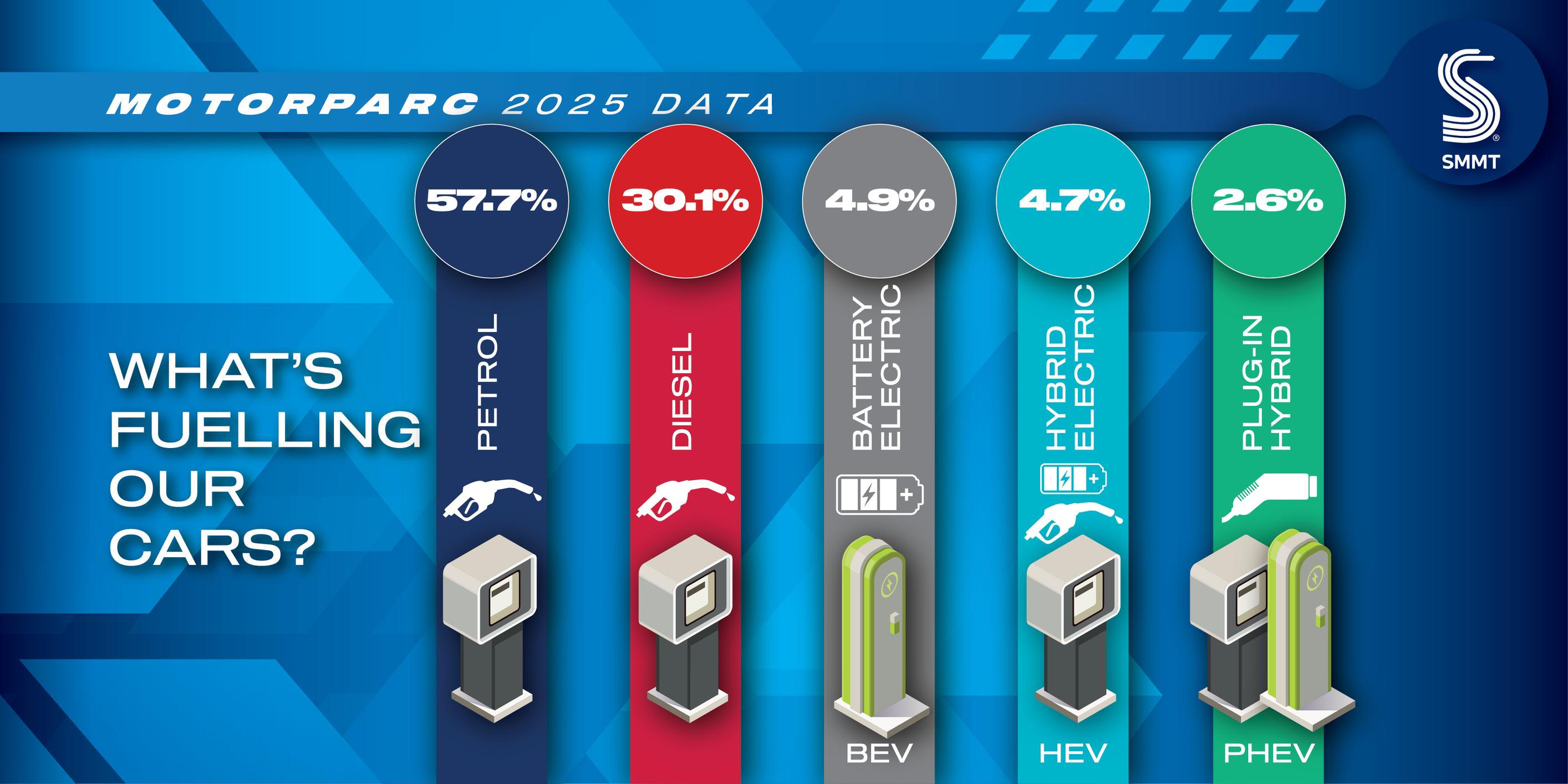 Meanwhile, a record 1,797,809 battery electric cars are now in use, up 34.7% on 2024 after significant uplifts in the new car market, driven by unprecedented manufacturer discounting and government incentives, and now accounting for almost 5% of the car parc.