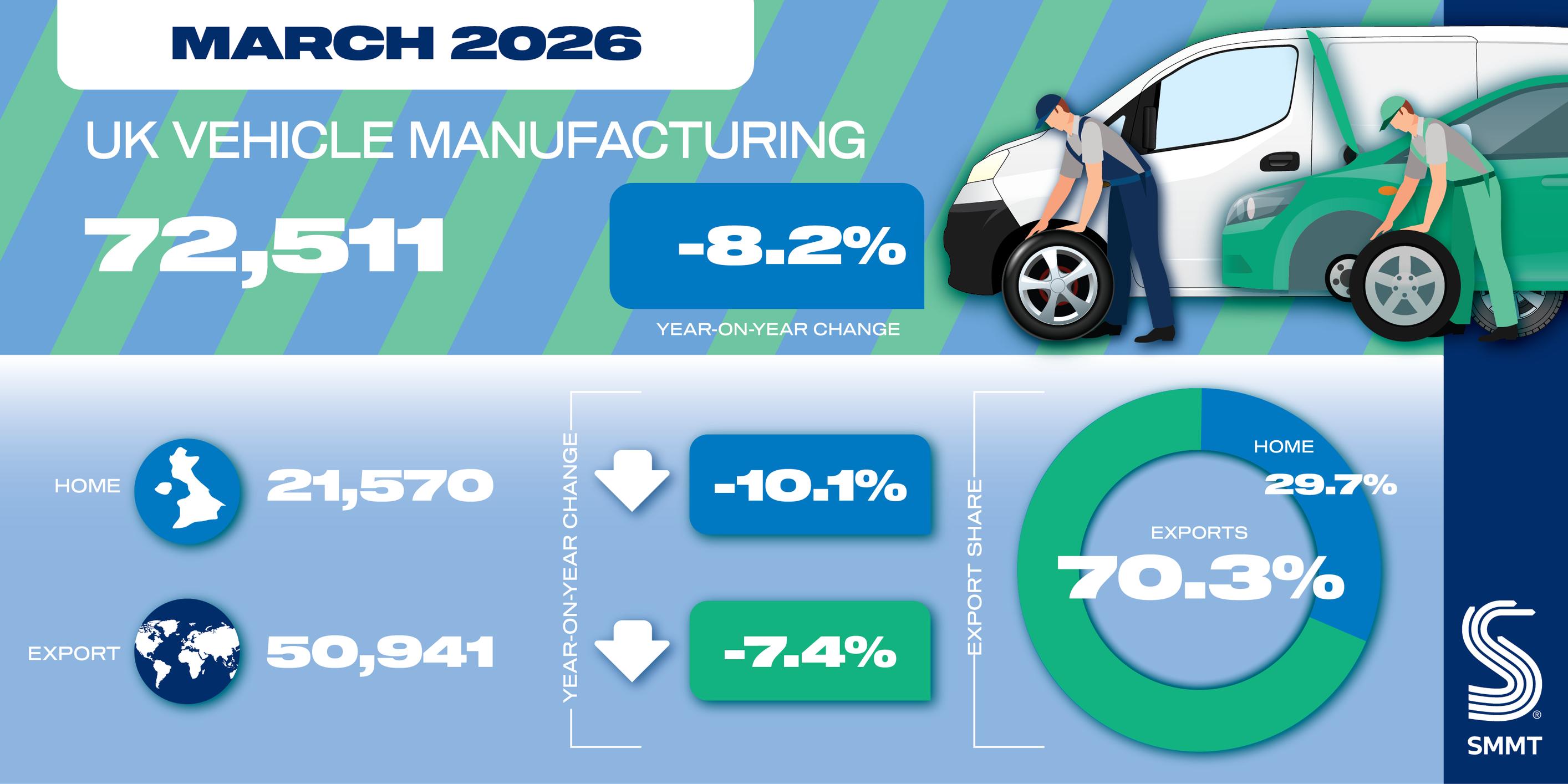 UK vehicle production fell -8.2% in March, with 72,511 units rolling out of factories, according to the latest figures published by the Society of Motor Manufacturers and Traders (SMMT).