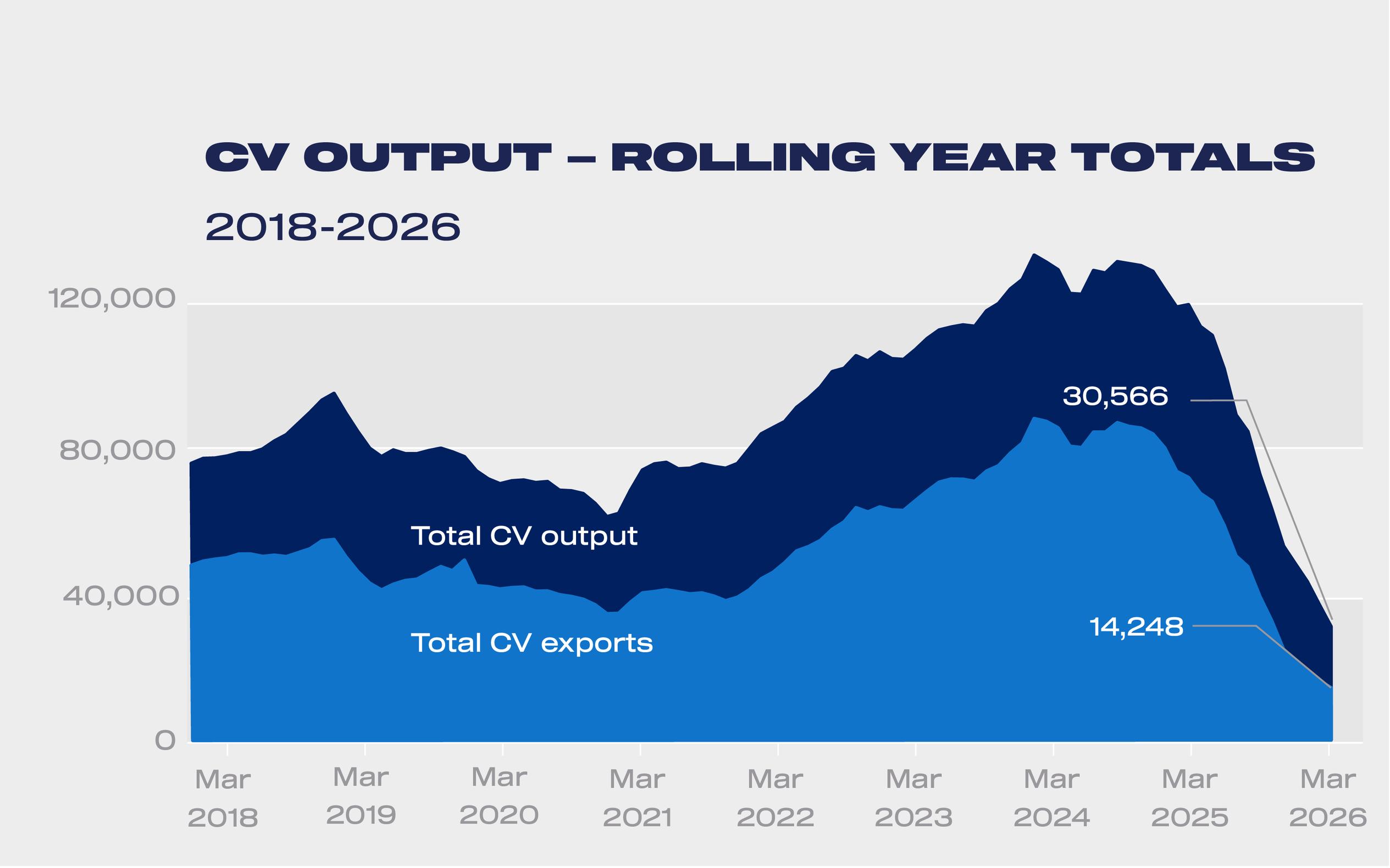 In the first quarter, UK factories produced 208,088 vehicles, down -13.0% on the same period in 2025. Car output fell -6.7% to 200,889 units, while CV volumes declined -70.0% to 7,199 units, again due primarily to last year’s closure of one of the UK’s larger plants. Output for overseas markets represented 75.8% of all vehicles made, although exports fell -12.4%, with production for the UK down -14.8%.