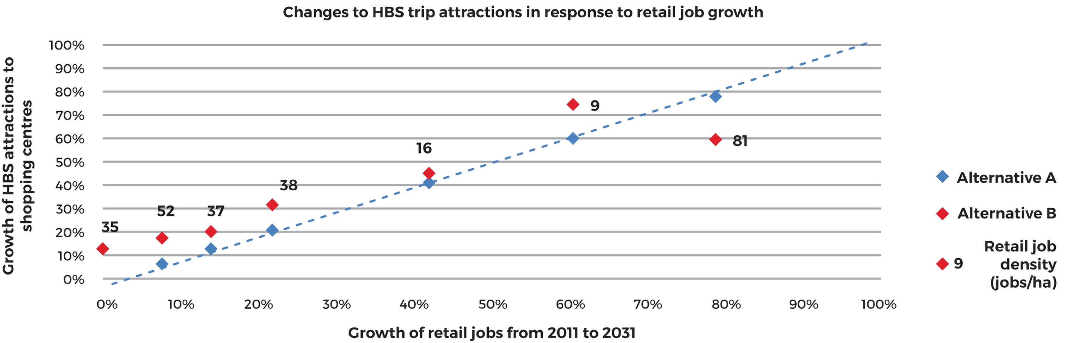 In terms of forecasting outcomes, Figure 1 illustrates the increase of HBS trip attraction to the shopping centres from 2011 to 2031, in response to the growth of retail jobs. It shows that in Alternative A, trip attractions increase in a linear fashion with growth in jobs, whilst Alternative B reflects the density effect for forecasting: trip attractions increase at a faster rate when the growth is added to a site with a relatively low job density than when growth is added to a site with an already high job density.