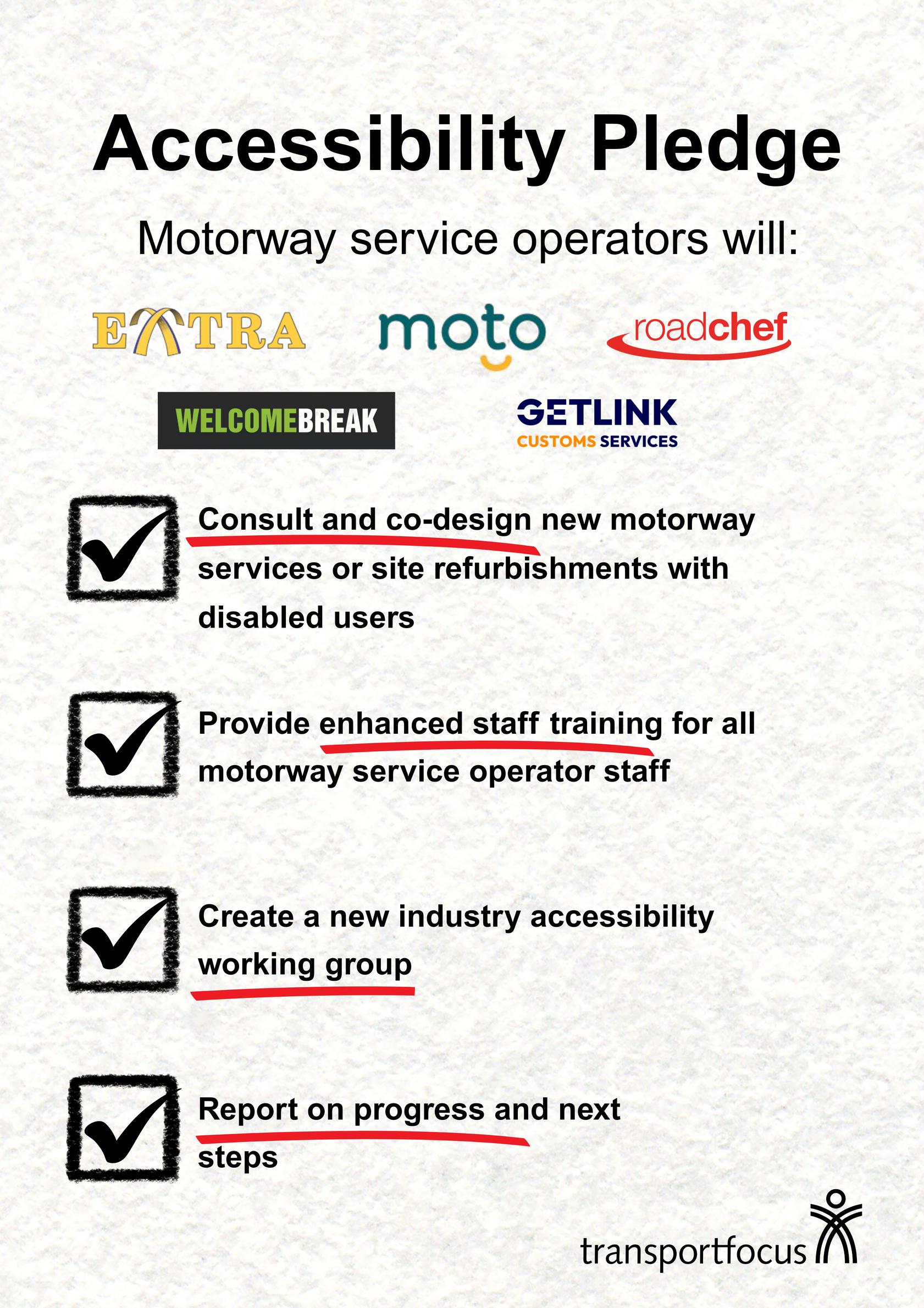 The pledge created by independent transport watchdog Transport Focus commits Moto, Roadchef, Welcome Break, Extra and Getlink Customs Services to do more to support disabled drivers.