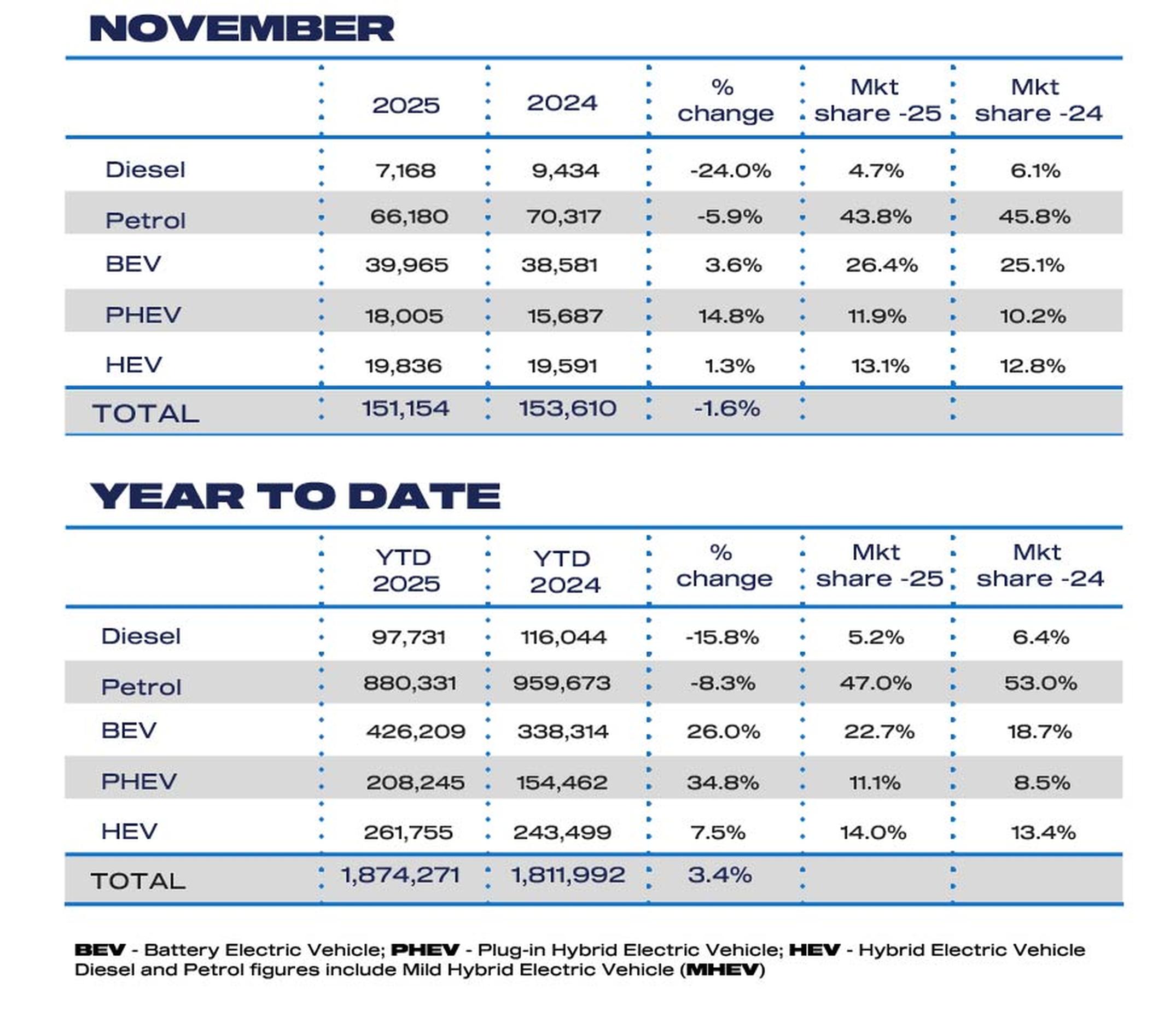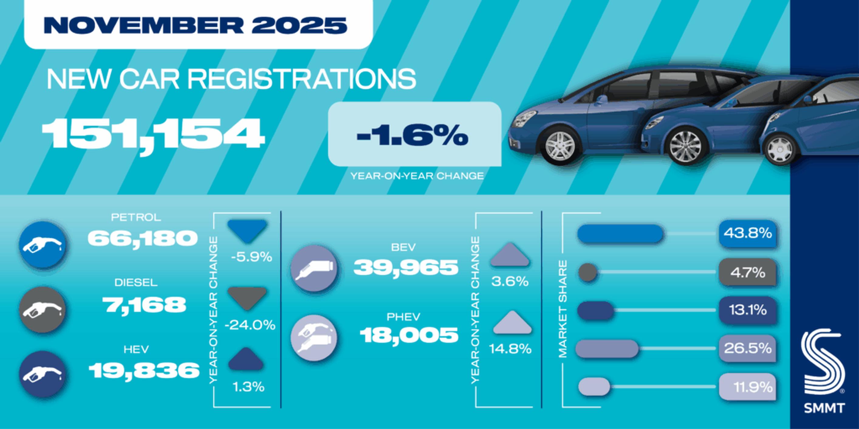 The UK new car market declined slightly in November as new registrations fell by -1.6% to 151,154 units, according to the latest figures from the Society of Motor Manufacturers and Traders (SMMT).