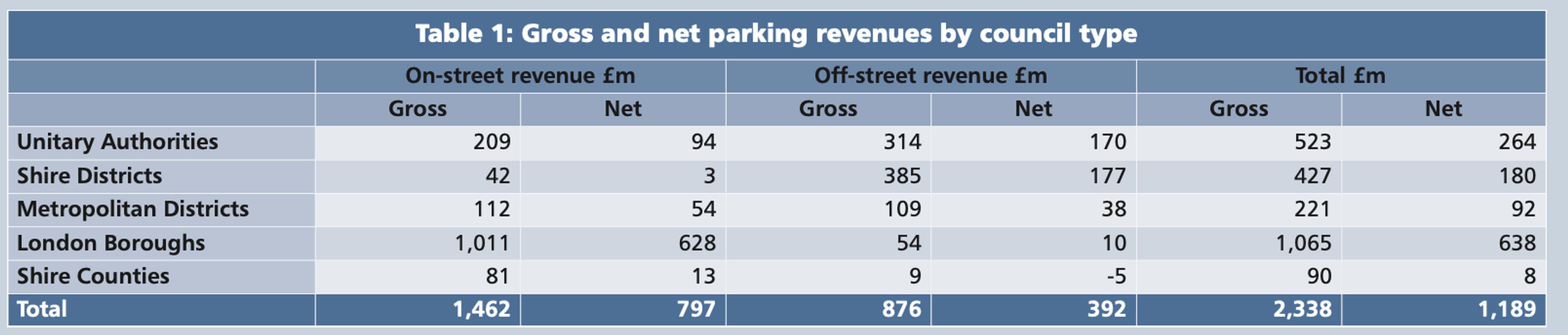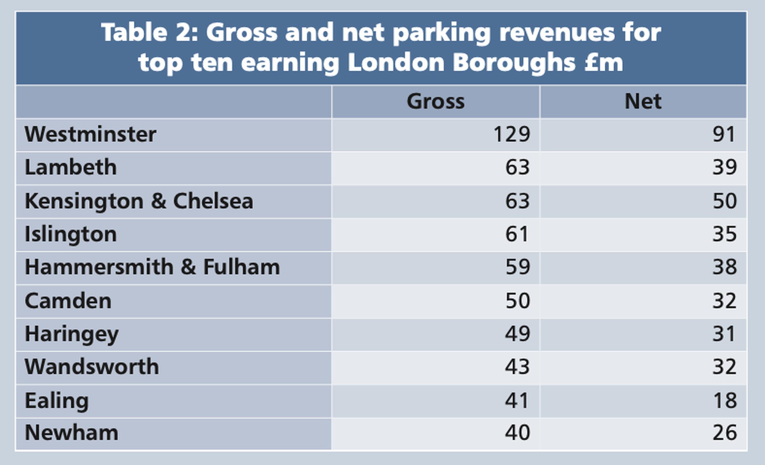 Table 1 provides a high-level summary of revenue by type of council. As can be seen, London dominates on-street parking, accounting for 69% of gross and 79% of net revenues. While across both on and off-street parking, London accounts for 54% of net revenues. Westminster is poised to become the first council to net £100m from parking charges, nearly matching its Council Tax revenue of £105m highlighting the importance of parking revenue to the council.