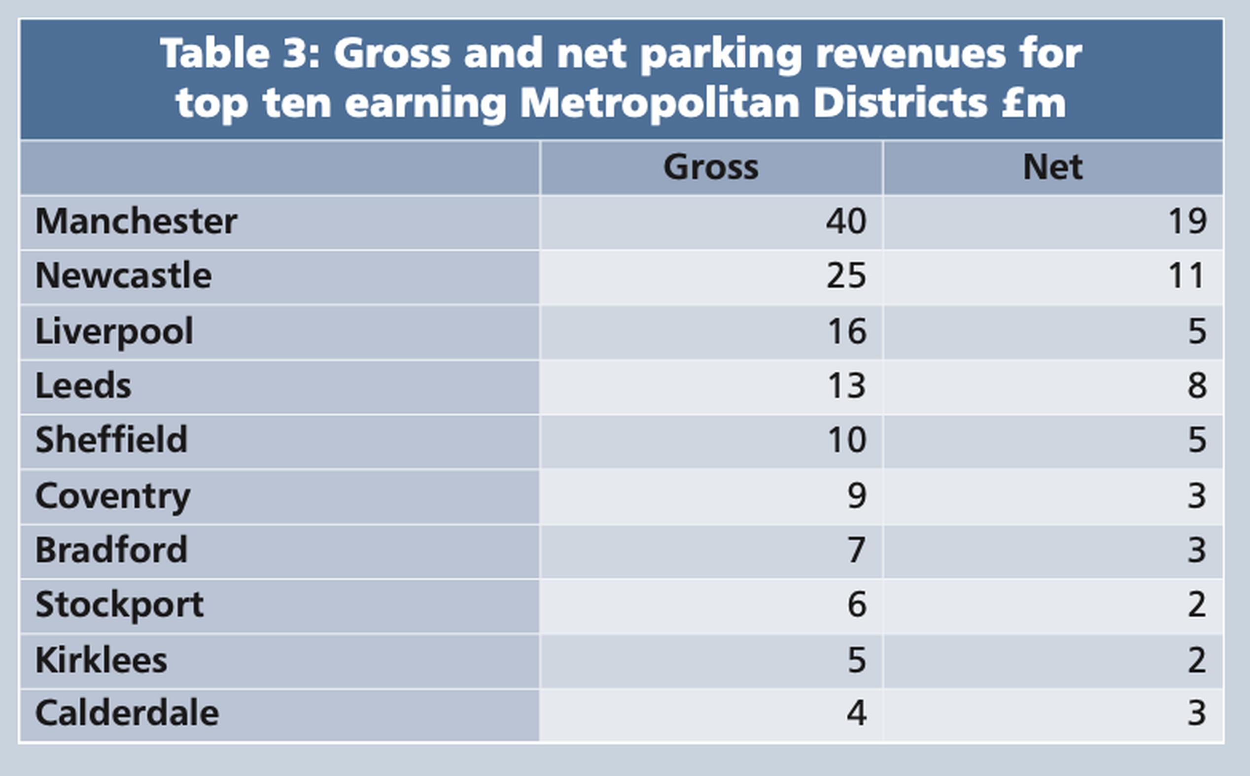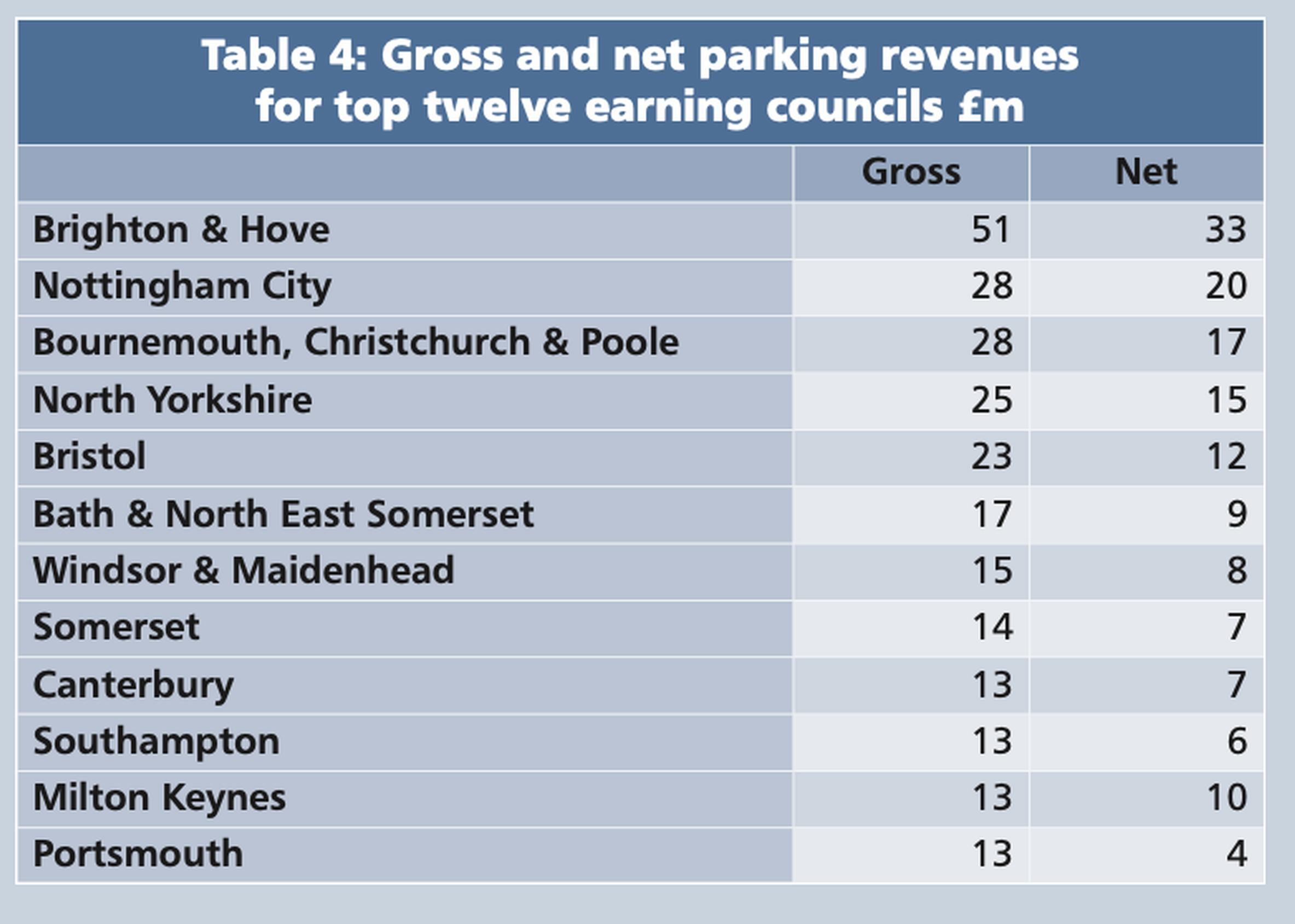 Table 2 highlights the top ten London grossing councils. It is notable that there are large differences in the cost of parking operations between the councils. Kensington & Chelsea report operating costs of just £13m, half of Islington’s £26m. Across London, based on London Council’s enforcement data, PCNs alone will have brought in, in excess of £250m. Amongst the Metropolitan Districts only Manchester and Newcastle netted more than £10m, while for most councils parking revenues is relatively small change (Table 3). Amongst the other local authorities, there are few (e.g. Brighton) where parking revenues are significant, but there are only six that net more than £10m a year (Table 4).