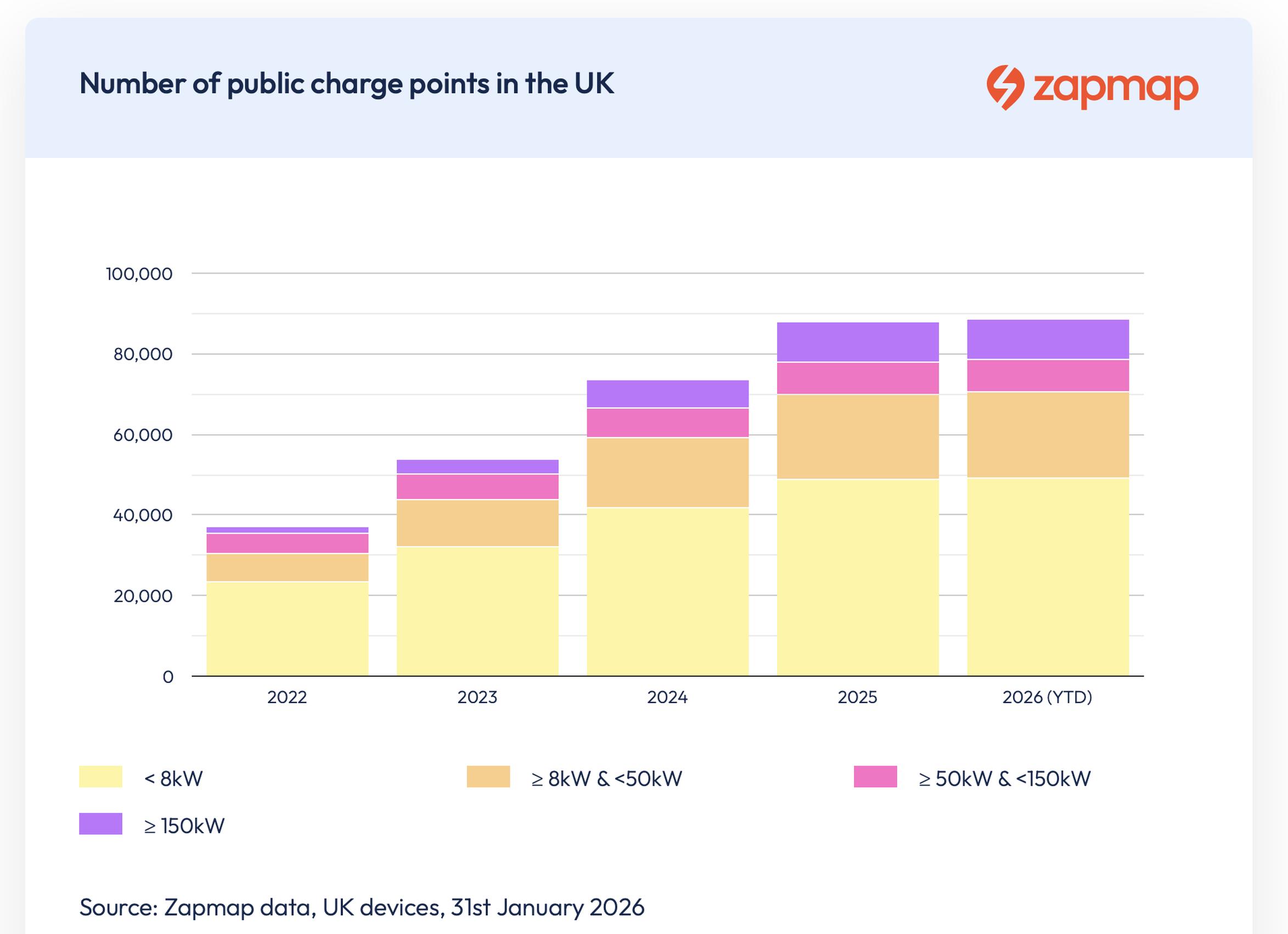 At the end of January 2026, there were 88,513 electric vehicle charging points across the UK, across 45,242 charging locations, 116,729 charging devices and 122,690 connectors.