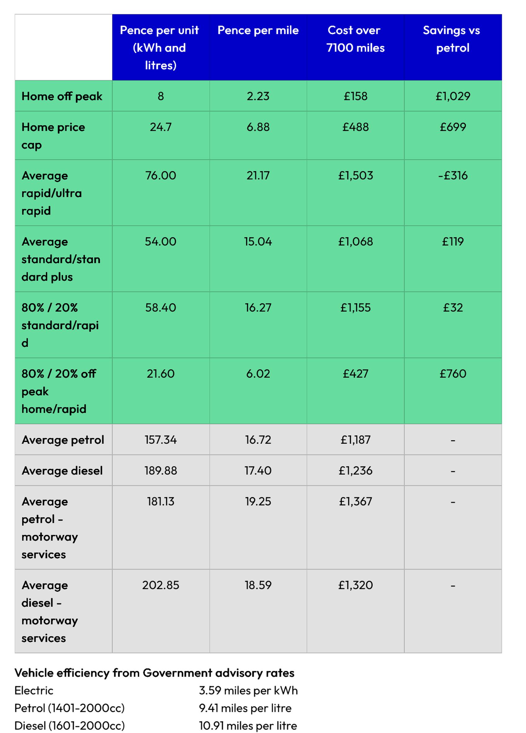 For average annual mileage of 7,100 miles, this means an EV charged solely on a standard public charger could save a driver £124 a year compared with petrol, or £37 with an 80/20 mix of standard and ultra-rapid.