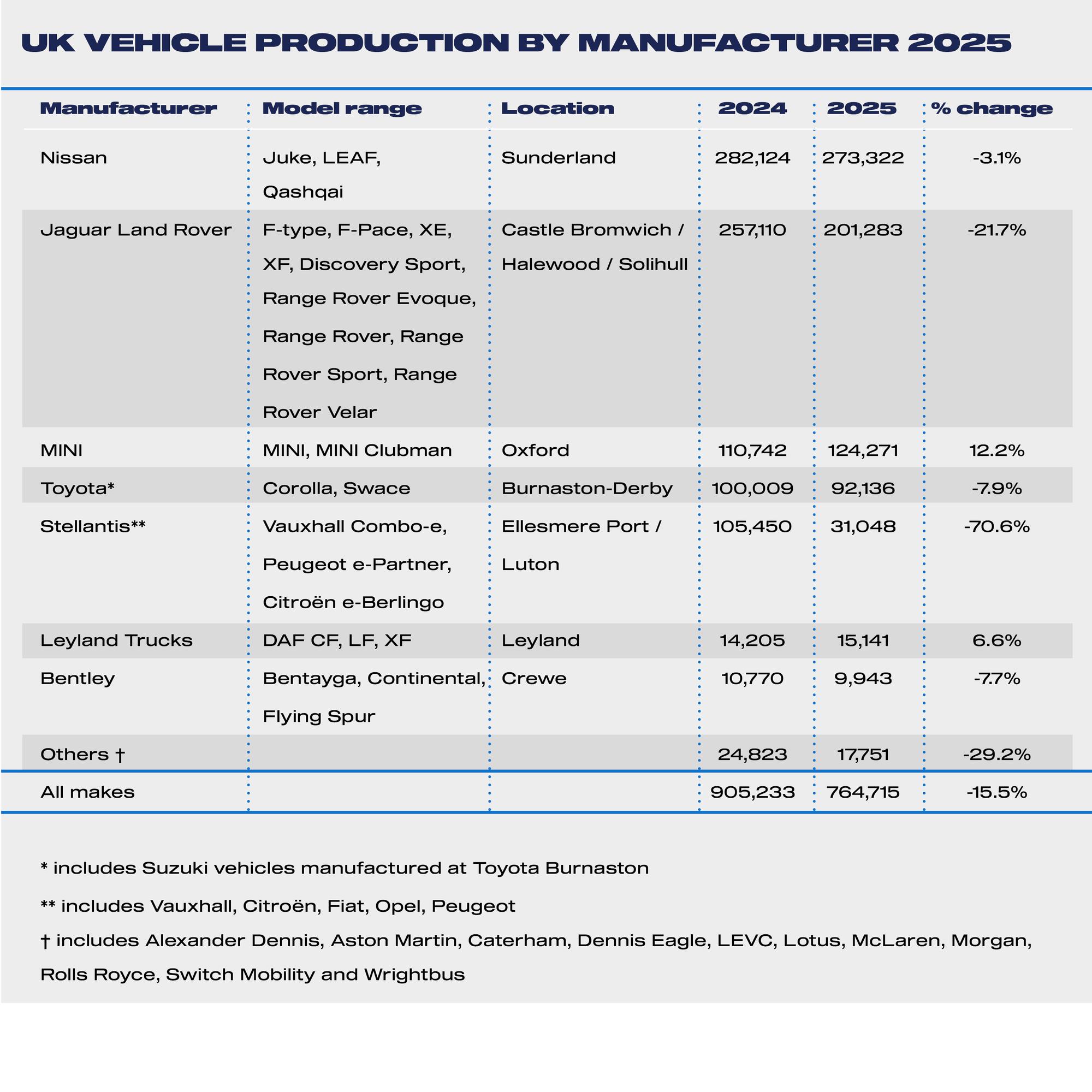 UK vehicle production fell -15.5% in 2025, according to the latest figures published by the Society of Motor Manufacturers and Traders (SMMT).