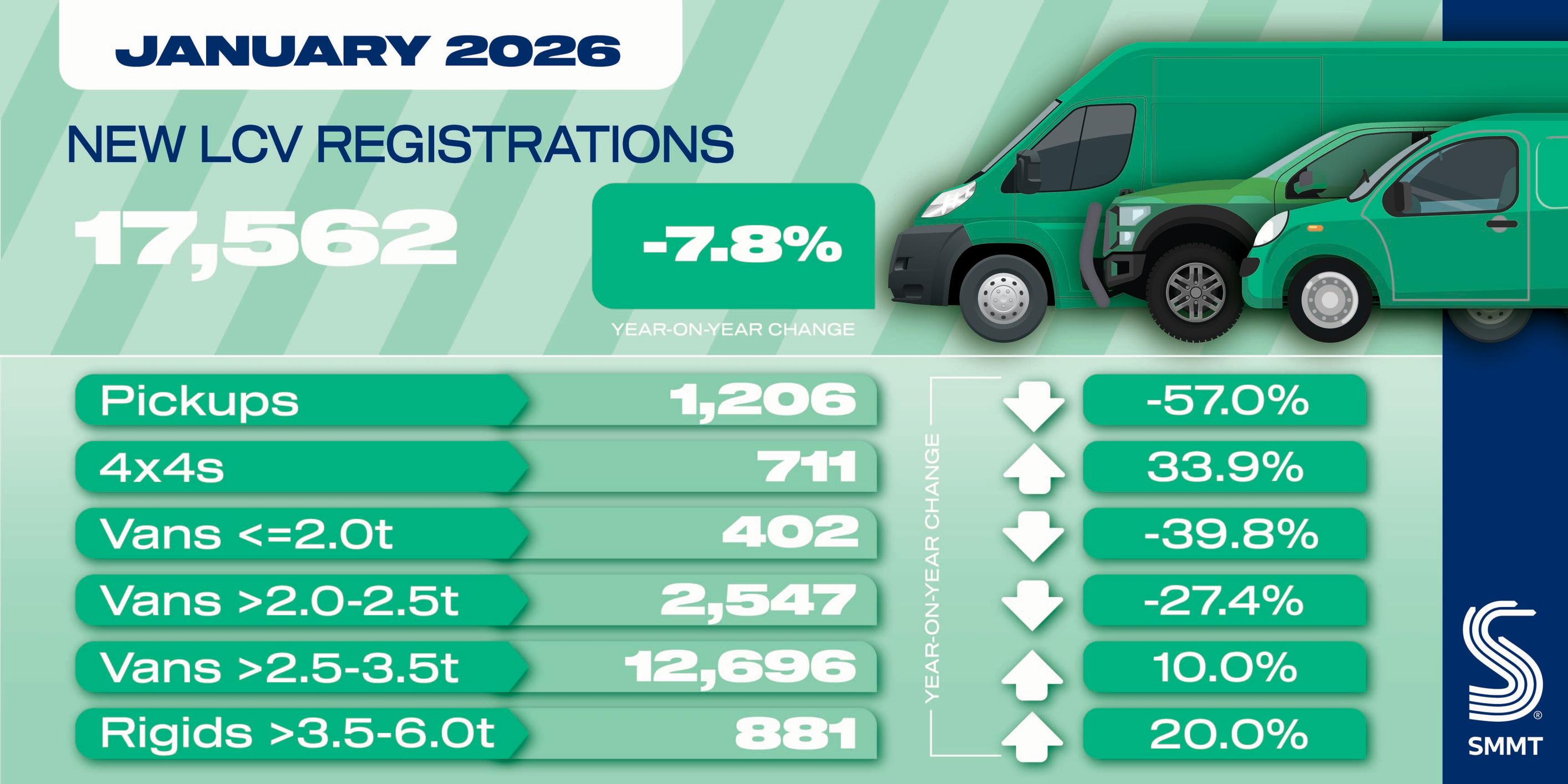 New light commercial vehicle (LCV) registrations fell by -7.8% in the first month of 2026 with 17,562 vans, pickups and 4x4s joining UK roads, according to the latest figures published by the Society of Motor Manufacturers and Traders (SMMT). This marks the weakest start to a year since 2012’s 16,049 registrations and reflects a tough economic environment, with weak business confidence constraining fleet investment.