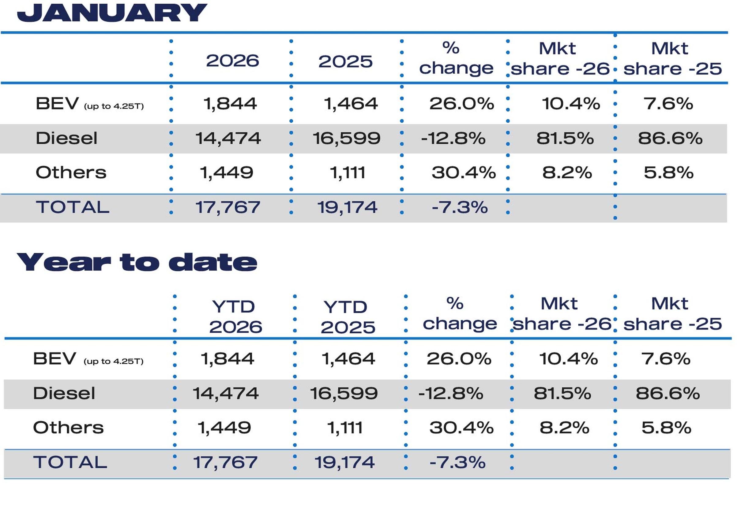 The decline was driven by a -57.0% slump in demand for new pickups to 1,206 units, following government fiscal changes to treat double cabs as cars for benefit in kind and capital allowance purposes, which industry warned would heap additional costs onto buyers.